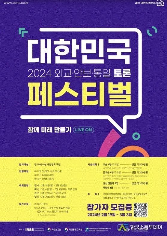 한국소통투데이 관리자 기자 | 국가안보전략연구원, 국립외교원, 국립통일교육원, 국방대학교 국가안전보장문제연구소가 공동 개최하는 '2024 대한민국 외교·안보·통일 토론 페스티벌'이 3월 개최된다. 외교안보 유관기관들이 뜻을 모아 공동으로 기획·진행하는 이번 행사는 만 19세 이상 대한민국 국민이면 누구나 참여 가능하며, 3월 3일까지 홈페이지를 통하여 신청할 수 있다. 우리나라의 외교·안보·통일 현안에 관심있는 국민들이 많이 참여하여 풍성한 토론의 장이 마련될 것으로 기대된다.