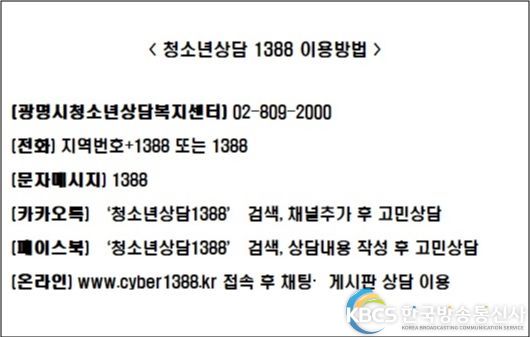 이번 사건·참사를 목격하거나 친구·지인의 상실로 심리적 어려움을 겪고 있는 청소년, 보호자, 교사는 광명시청소년상담복지센터(☎02-809-2000)로 문의하면 상담 서비스를 받을 수 있다. 또한 전화, 모바일, 온라인 등을 통한 청소년상담 1388에서도 24시간 상담 지원을 받을 수 있다.