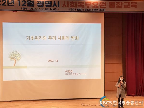 한국방송통신사 관리자 기자 | 광명시는 13일 광명시청소년수련관 대공연장에서 사회복무요원 250여 명을 대상으로 이영경 전문 강사를 초빙해 ‘기후 위기와 우리 사회 변화’라는 주제로 소양 교육을 실시했다.