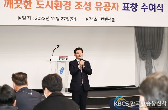 한국방송통신사 관리자 기자 | 이상일 용인특례시장이 27일 올 한해 깨끗한 용인시를 만들기 위해 노력해 온 환경미화원 등 유공자 24명에게 표창을 수여하고 노고를 격려했다.