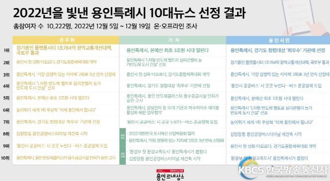 한국방송통신사 관리자 기자 | 올해 용인특례시가 이룬 많은 성과 가운데 용인시 공직자는 ‘경기용인 플랫폼시티 1조784억 광역교통개선대책, 국토부 통과’를 ‘용인특례시 10대 뉴스’ 중 1위로 선정했다. 용인 언론인은 ‘용인특례시, 본예산 최초 3조원 시대 열린다’를, 시민은 ‘용인특례시, 경기도 청렴대상 최우수기관에 선정’을 1위로 꼽았다.