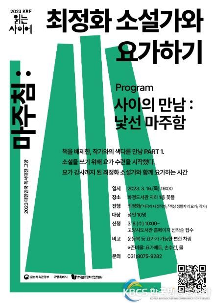 한국방송통신사 관리자 기자 | 고양특례시가 2023 대한민국 독서대전을 유치해 다양한 책의 도시 연중 프로그램을 펼치고 있는 가운데, 3월 16일(목) 저녁 7시 화정도서관 꽃뜰에서 ‘최정화 소설가와 요가하기’ 프로그램을 추진해 시선을 사로잡고 있다.