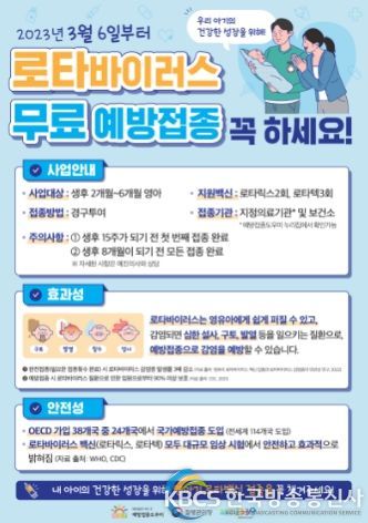 한국방송통신사 관리자 기자 | 고양특례시 덕양구보건소가 3월 6일부터 로타바이러스 무료 예방접종을 시행하고 있다. 이전까지는 유료 예방접종이었으나, 올해부터 국가필수예방접종 18종에 포함되어 무료로 시행한다.