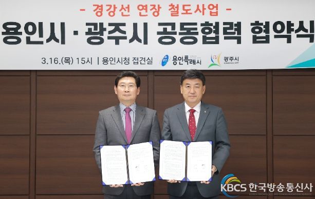 한국방송통신사 관리자 기자 | 용인특례시가 16일 경기도 광주시와 ‘경강선 연장 철도사업의 효율적 추진을 위한 공동협력 협약’을 맺었다.