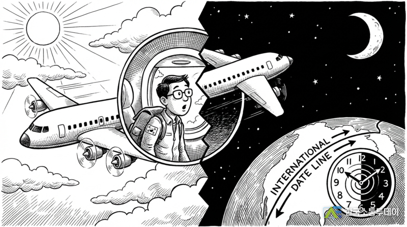 어느 순간 날짜 변경선을 지나면서 낮과 밤이 갑자기 뒤바뀌고 시간의 흐름도 달라집니다.