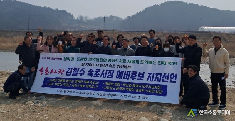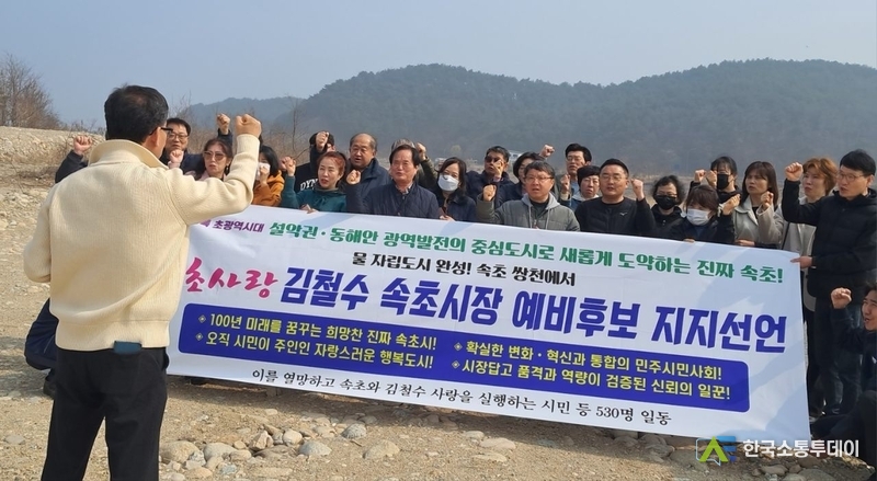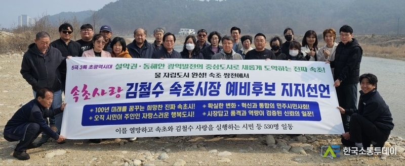 [속초=양호선 기자] 더불어민주당 강원도당의 후보 발표와 함께 본격적인 경선 레이스의 막이 오른 가운데, 속초시장 선거 판세를 뒤흔들 메가톤급 지지 선언이 나왔다. 속초시민과 민주당 핵심 당원 등 530명은 26일 오후, 속초 물 부족 해결의 상징적 장소인 쌍천에 집결해 김철수 예비후보에 대한 전폭적인 지지를 공식 선언했다.