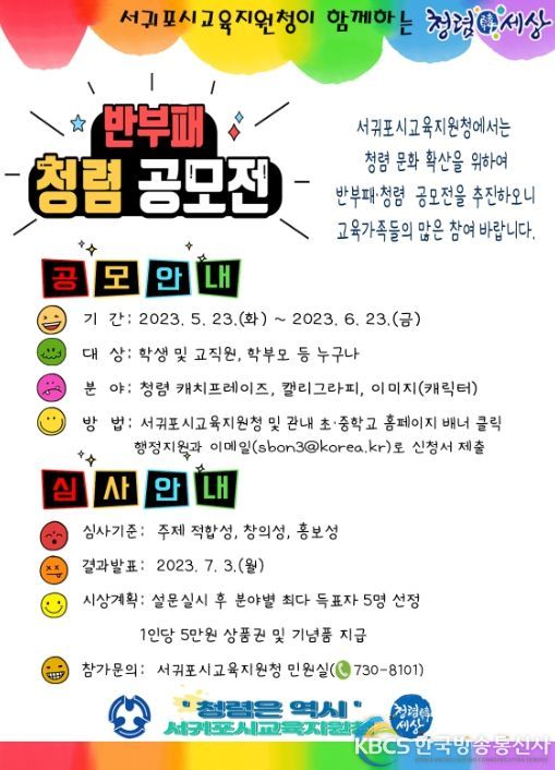 한국방송통신사 관리자 기자 | 서귀포시교육지원청은 5월 23일부터 6월 23일까지 교직원, 학생, 학부모 등을 대상으로‘2023년 반부패·청렴 공모전’을 추진한다고 밝혔다.