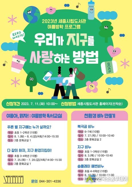 한국소통투데이 관리자 기자 | 세종시립도서관이 오는 11일부터 ‘생태·환경’을 주제로 한 여름방학 프로그램인 ‘우리가 지구를 사랑하는 방법’에 참여할 초등학생 70명을 선착순 모집한다.