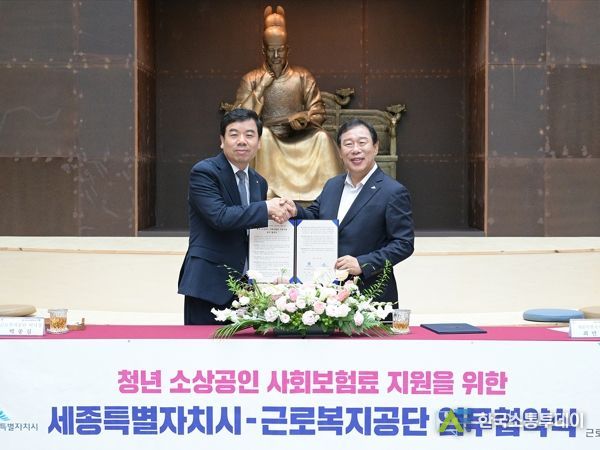 한국소통투데이 관리자 기자 | 세종특별자치시가 청년 소상공인 사회보험료 지원을 위해 13일 세종시청에서 근로복지공단(박종길 이사장)과 업무협약을 체결했다.