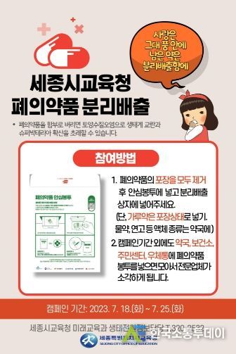 한국소통투데이 관리자 기자 | 세종특별자치시교육청은 우정사업본부와 함께하는 ‘폐의약품 분리배출 캠페인’을 실시한다.