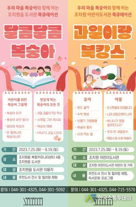 이번 북큐레이션은 복숭아 산지 조치원 도서관 2곳 ▲조치원읍 도서관(대첩로 76, 조치원읍 복합커뮤니티센터 4층) ▲조치원 어린이도서관(신흥샛터3길 3)에서 진행된다.