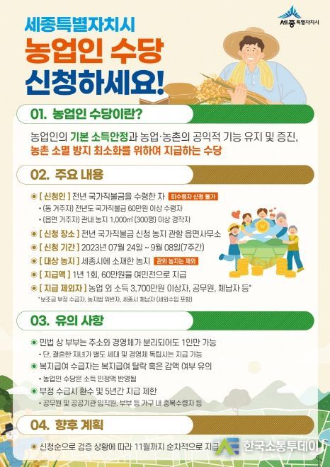 한국소통투데이 관리자 기자 | 세종특별자치시가 오는 31일부터 9월 8일까지 전년도 국가공익직불금을 신청한 읍면동행정복지센터에서 농업인 수당을 접수한다고 28일 밝혔다.