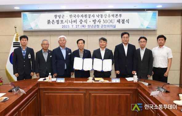 한국소통투데이 관리자 기자 | 창녕군은 지난 27일, 군청 군정회의실에서 한국수자원공사 낙동강유역본부와 붉은점모시나비 증식·방사 기술교류 및 공동협력에 대한 MOU를 체결했다. 이번 협약식에는 성낙인 창녕군수, 한국수자원공사 낙동강유역본부 차종명 본부장과 관계자들이 참석했다.
