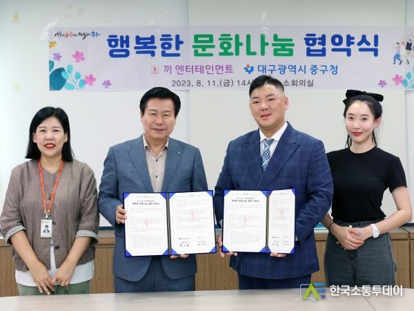 한국소통투데이 관리자 기자 | 대구 중구는 지난 11일 중구청 소회의실에서 끼 엔터테인먼트와 지역 내 문화 소외계층 지원과 유기적인 상호 협력체계 구축을 위한 ‘행복한 문화나눔 협약’을 체결했다.