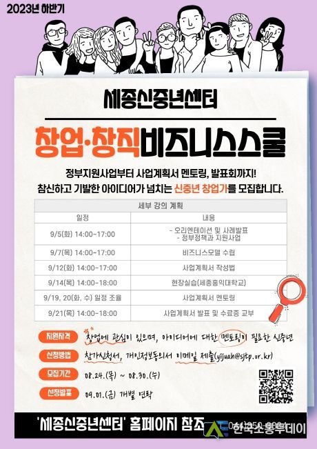 한편, 창업·창직 비즈니스스쿨과 관련한 자세한 내용은 센터 누리집을 확인하면 된다.