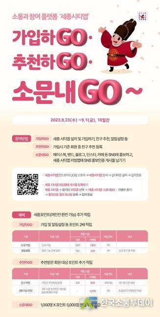 신규 가입과 알림설정, 추천을 받은 회원은 포인트가 2배 적립되며, 누리소통망(SNS)에 서비스 홍보 인증시 세종포인트 5,000점이 추가 적립되는 혜택이 제공된다.