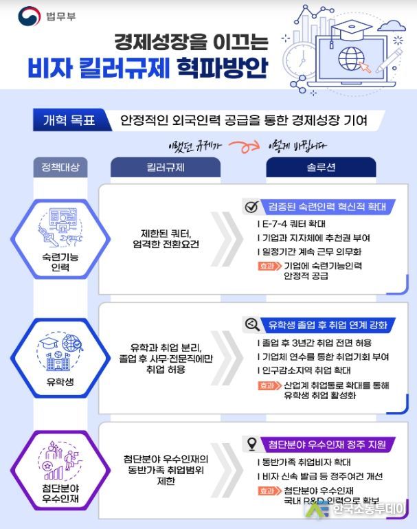 한국소통투데이 관리자 기자 | 법무부는 8월 24일 제4차 규제혁신전략회의에서 ‘경제성장을 이끄는 비자 킬러규제 혁파방안’을 발표했다.