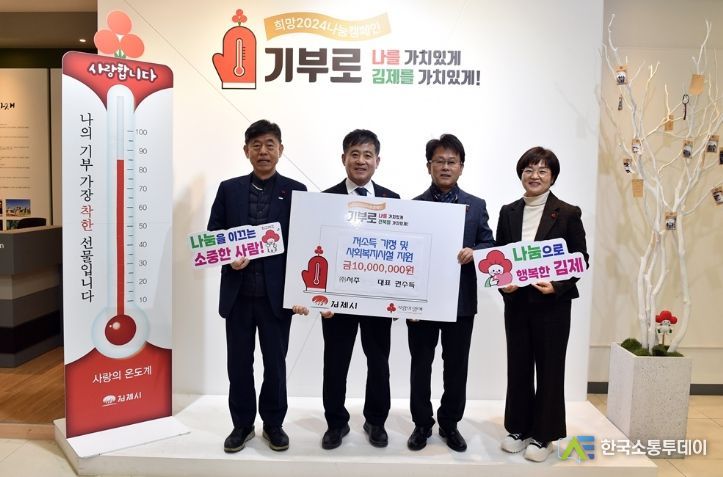 18일 김제시 요촌동에 위치한 ㈜서주우유(대표 권수득)가 관내 저소득 가정을 위해 써달라며 김제시에 이웃돕기 성금 1천만원을 기탁했으며 한전MCS(주) 김제지점(지점장 유순이)에서도 사회봉사단 15명이 십시일반 모금한 이웃돕기성금 50만원을 기탁하여 나눔을 통해 사랑의 온도를 올리는 ‘희망2024 나눔캠페인’에 동참했다.