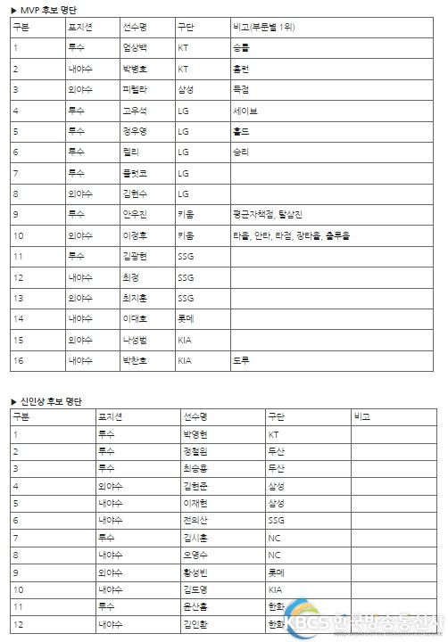 한국방송통신사 관리자 기자 | KBO가 올 시즌 최고의 활약을 펼친 MVP와 신인상을 수상할 선수 후보를 최종 확정했다.