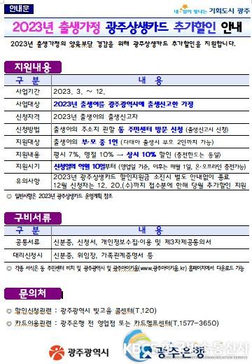 한국방송통신사 관리자 기자 | 광주광역시는 출생가정의 경제적 양육부담 완화를 위해 2023년 출생가정을 대상으로 광주상생카드 추가할인을 지원한다.