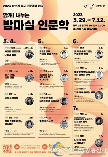 한국방송통신사 관리자 기자 | 광주 동구는 ‘함께 나누는 밤마실 인문학’을 주제로 다수의 명망 있는 강사들을 모시고 올해 상반기 동구 인문대학을 개강한다고 밝혔다.