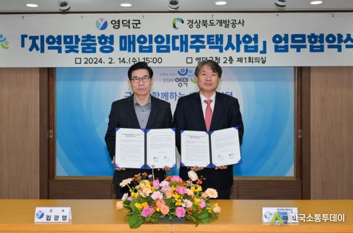 한국소통투데이 관리자 기자 | 영덕군은 지방의 인구감소에 대응하고 군민에게 안정적이고 합리적인 주거 공간을 제공하기 위해 지난 14일 군청 제1회의실에서 경상북도개발공사와 지역 맞춤형 공공매입임대주택 사업을 위한 업무협약을 체결했다.