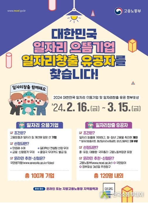 한국소통투데이 관리자 기자 | 고용노동부는 올해 「대한민국 일자리 으뜸기업」과 「일자리창출 유공 정부포상」 선정 계획을 공고하고, 2월 16일부터 3월15일까지 신청서 및 추천서를 접수한다고 밝혔다.